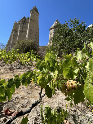 Nel terreno scosceso, dove tra la sabbia e le pietre si scorgono fossili, la vite, porta i suoi frutti, coltivata dalla mano dell’uomo a cespuglio, libera di trovare la conformazione più idonea a resistere in questo arido clima. La vite porta con sé anche un senso di libertà, come se volesse insegnare che ogni cosa è fragile eppure, nello stesso tempo, resistente, e che ogni desiderio, anche il più nascosto, può trovare uno spazio tra le pieghe di questa valle di pietra e di sogni.
